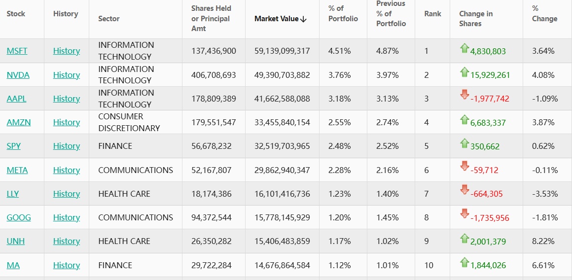 英伟达(NVDA.US)位列第二,持仓大约4.07亿股,持仓市值约494亿美元,占投资组合比例为3.76%,较上季度持仓数量增长4.08%。