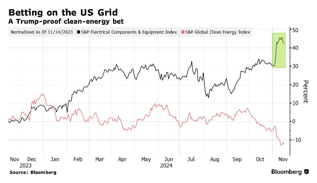 这一呼吁已经得到了回报。自11月5日大选以来,衡量输电网设备的一项关键股市指标已经上涨了约6%,而涵盖范围更广的更广泛的标普全球清洁能源指数下跌了约十分之一。很大一部分收入来自美国市场的亚洲和欧洲供应商也出现了反弹,日本日立公司同期涨幅超过8%。