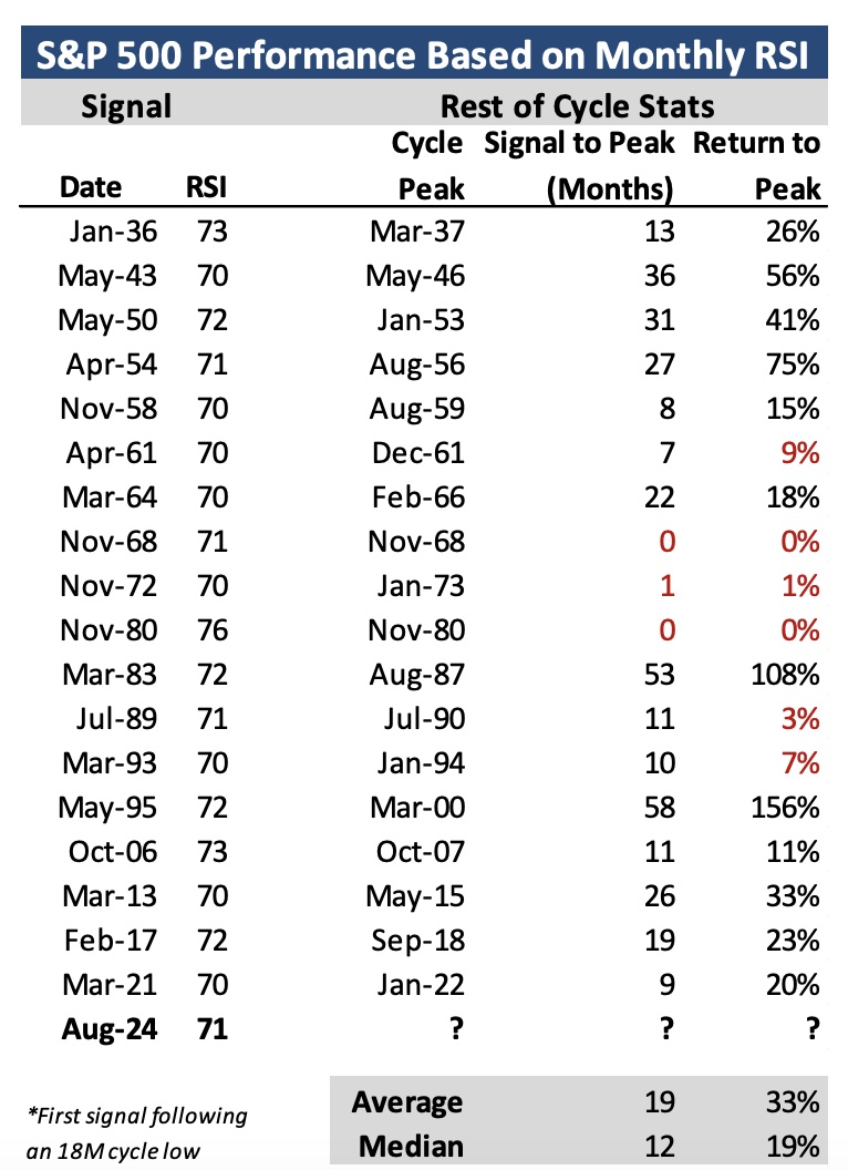 “自1936年以来,标普500指数14个月RSI首次达到70和周期峰值之间的持续时间中位数为12个月,在此期间的中位数回报率为+19%,”Wald表示,“这个信号是在8月底发出的。”