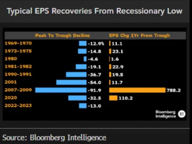 BI编制的数据显示,从峰值到低谷,以过去12个月的角度来看,标普500指数在去年结束的三个季度盈利衰退中每股收益收缩了13%。这远低于上世纪60年代末以来26%的峰值至谷底跌幅中值。