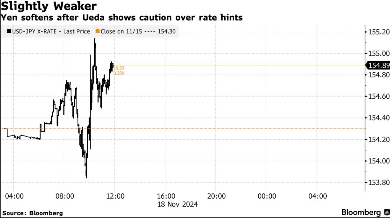 在植田和男发表讲话后,日元汇率持续走弱,美元兑日元上升0.5%,至1美元兑155.14日元,基准的10年期日本国债收益率小幅下跌,因为植田和男的最新言论比一些市场参与者预期的要温和得多。隔夜指数掉期继续定价下月加息的可能性,12月日本央行加息的可能性约为54%。