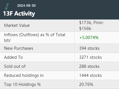 据统计,花旗第三季度持仓总市值达到1730亿美元,上一季度总市值为1560亿美元,环比增长11%。花旗在第三季度的投资组合中新增了394只个股,增持了3271只个股,减持1444只个股,清仓288只个股。其中前十大持仓标的占总市值的20.76%。