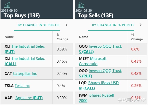 从持仓比例变化来看,前五大买入标的分别是:工业指数ETF-SPDR看跌期权(XLI.US,PUT)、工业指数ETF-SPDR看涨期权(XLI.US,CALL)、卡特彼勒(CAT.US)、特斯拉、苹果看跌期权。