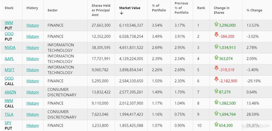 第六到第十大重仓股分别为:纳斯达克100指数ETF看涨期权(QQQ.US,CALL)、亚马逊(AMZN.US)、罗素2000指数ETF看涨期权(IWM.US,CALL)、特斯拉(TSLA.US)和SPDR标普500ETF看跌期权(SPY.US,PUT)。