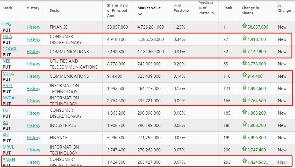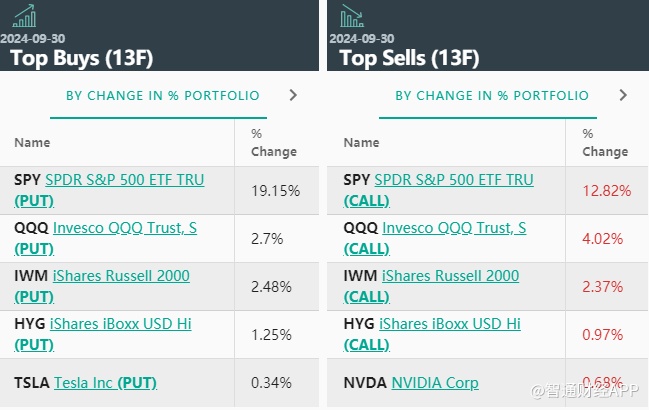 从持仓比例变化来看,前五大买入标的分别是:标普500指数ETF看跌期权、纳指100ETF看跌期权、罗素2000指数ETF看跌期权(IWM.US,PUT)、债券指数ETF-iShares iBoxx高收益公司债看跌期权(HYG.US,PUT)、特斯拉看跌期权(TSLA.US,PUT)。