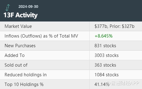 据统计,巴克莱银行第三季度持仓总市值达3770亿美元,上一季度总市值为3270亿美元,环比增长15%。巴克莱银行在第三季度的持仓组合中新增了831只个股,增持了3003只个股,减持了1084只个股,清仓了363只个股。其中前十大持仓标的占总市值的41.14%。