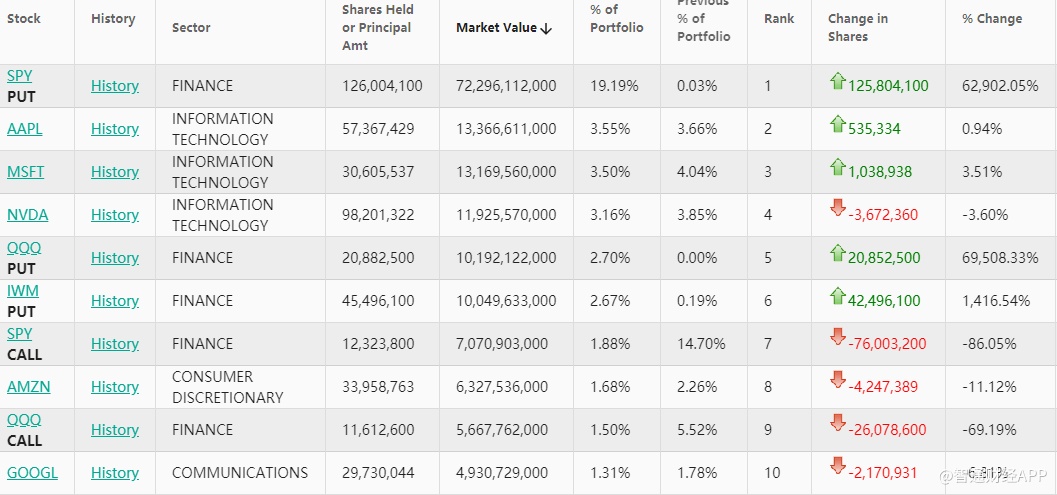 在前五大重仓股中,标普500指数ETF看跌期权(SPY.US,PUT)位列第一,持仓约1.26亿股,持仓市值约722.96亿美元,占投资组合比例为19.19%,较上季度持仓数量飙升62902.05%。