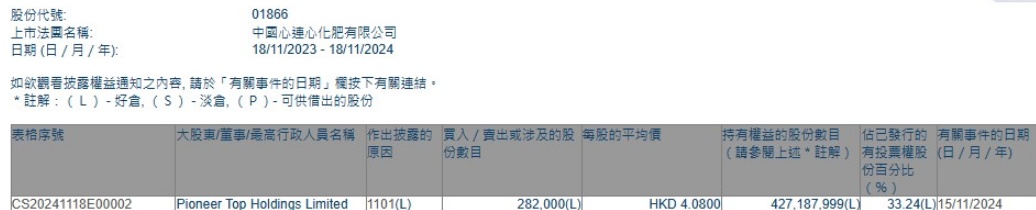 智通财经APP获悉,香港联交所最新资料显示,11月15日,Pioneer Top Holdings Limited增持中国心连心(01866)28.2万股,每股作价4.08港元,总金额为115.056万港元。增持后最新持股数目约为4.27亿股,最新持股比例为33.24%。