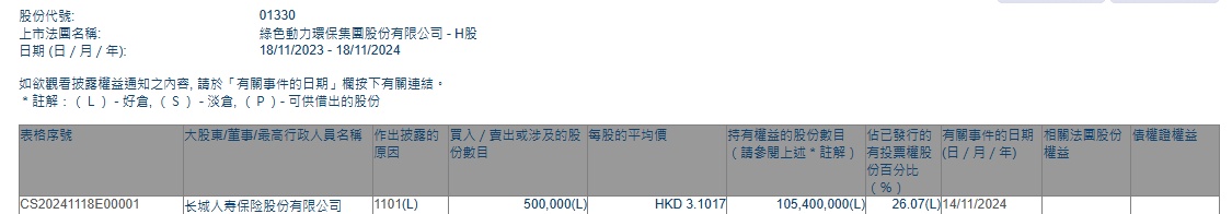 智通财经APP获悉,香港联交所最新资料显示,11月14日,长城人寿保险股份有限公司增持绿色动力环保(01330)50万股,每股作价3.1017港元,总金额为155.085万港元。增持后最新持股数目为1.054亿股,最新持股比例为26.07%。