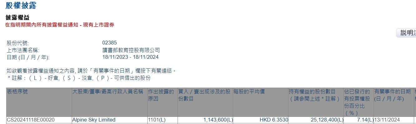 智通财经APP获悉,香港联交所最新资料显示,11月13日,Alpine Sky Limited增持读书郎(02385)114.36万股,每股作价6.353港元,总金额约为726.53万港元。增持后最新持股数目为2512.84万股,最新持股比例为7.14%。