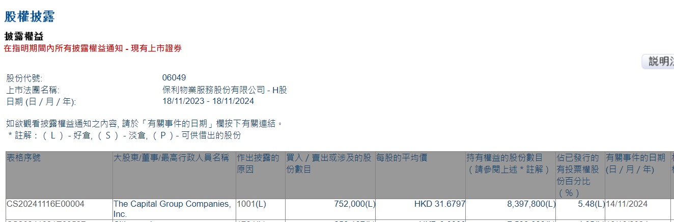 Inc.增持保利物业(06049)75.2万股,每股作价31.6797港元,总金额约为2382.31万港元。增持后最新持股数目为839.78万股,最新持股比例为5.48%。