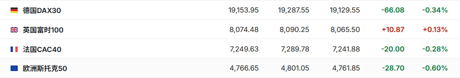 2. 截至发稿,德国DAX指数跌0.34%,英国富时100指数涨0.13%,法国CAC40指数跌0.28%,欧洲斯托克50指数跌0.60%。