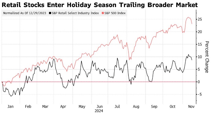 目前,市场对零售业绩的焦点落在两方面:一方面是对关键的假日购物季的业绩指引,以反应美国的消费状况;另一方面在于当选总统特朗普提出的关税计划的影响。美国最大的零售商、“美国零售消费风向标”沃尔玛(WMT.US)将于周二公布财报,塔吉特公司(TGT.US)、TJ Maxx的所有者TJX公司(TJX.US)等其他的零售商也将公布财报。