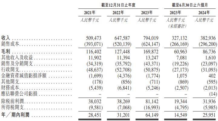 财务方面,2021年、2022年、2023年及2024年截至6月30日止六个月,优乐赛集团收入分别约为5.09亿元、6.48亿元、7.94亿元、3.83亿元人民币。同期,该公司实现年内利润分别为2845.1万元、3120.1万元、6414.9万元、2595.1万元人民币。