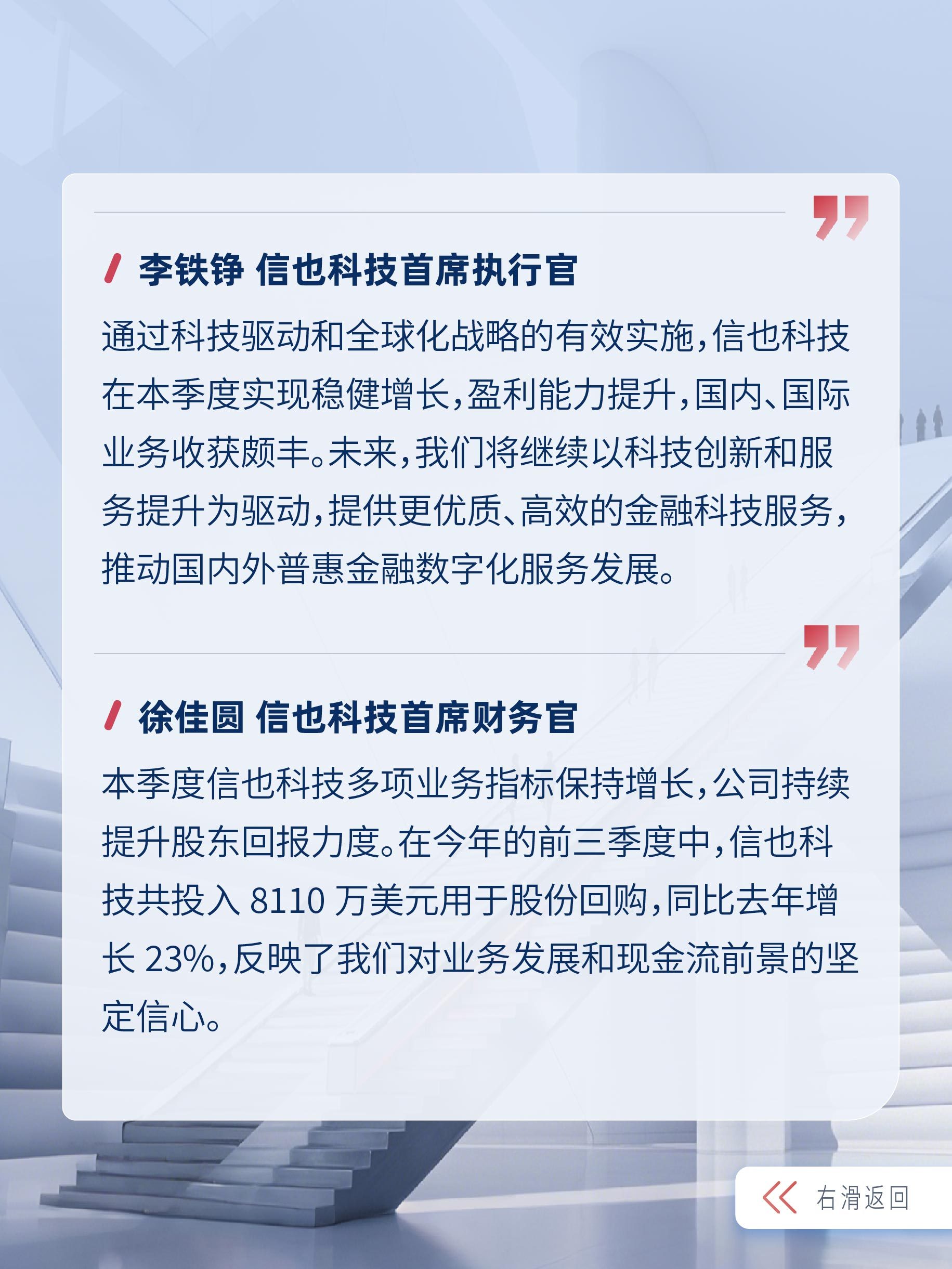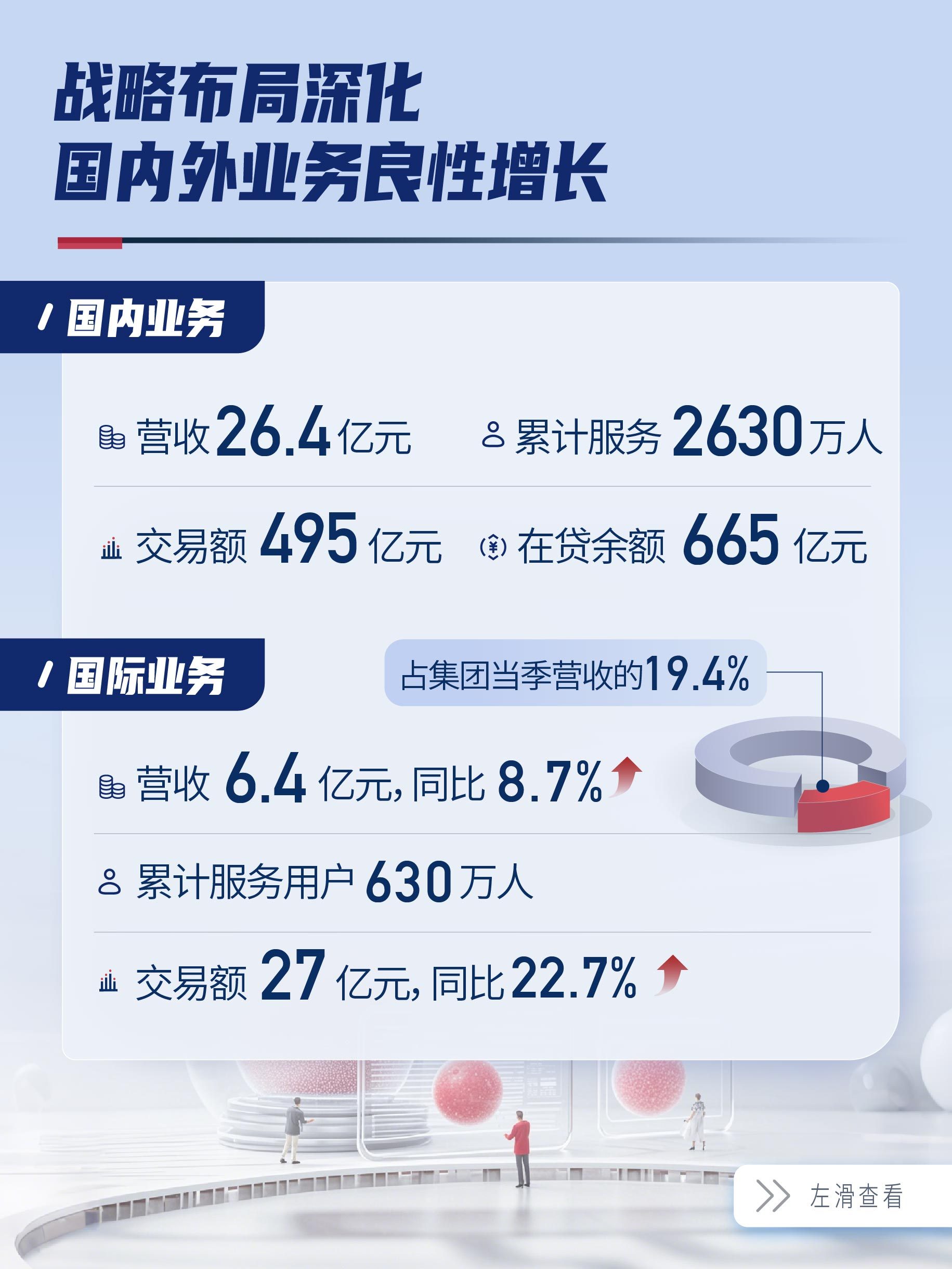 智通财经APP获悉,北京时间11月19日,信也科技(FINV.US)公布2024年第三季度(Q3)未经审计的财务报告。报告显示,信也科技三季度实现营收32.76亿元(人民币,下同),同比增长2.5%;净利润6.24亿元,同比增长8.6%。经营指标方面,当季促成交易额近522亿元,同比增长1.8%;在贷余额681亿元,同比增长3.3%。截至三季度末,公司国内、国际市场累计服务用户3260万人。