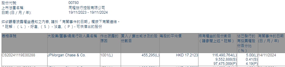 智通财经APP获悉,香港联交所最新资料显示,11月14日,摩根大通增持同程旅行(00780)45.5295万股,每股作价17.2123港元,总金额为约783.67万港元。增持后最新持股数目为1.16亿股,最新持股比例为5%。