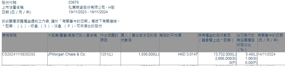 智通财经APP获悉,香港联交所最新资料显示,11月14日,小摩减持弘业期货(03678)193.6万股,每股作价3.0147港元,总金额约为583.65万港元。减持后最新持股数目为1373.2万股,最新持股比例为5.49%。