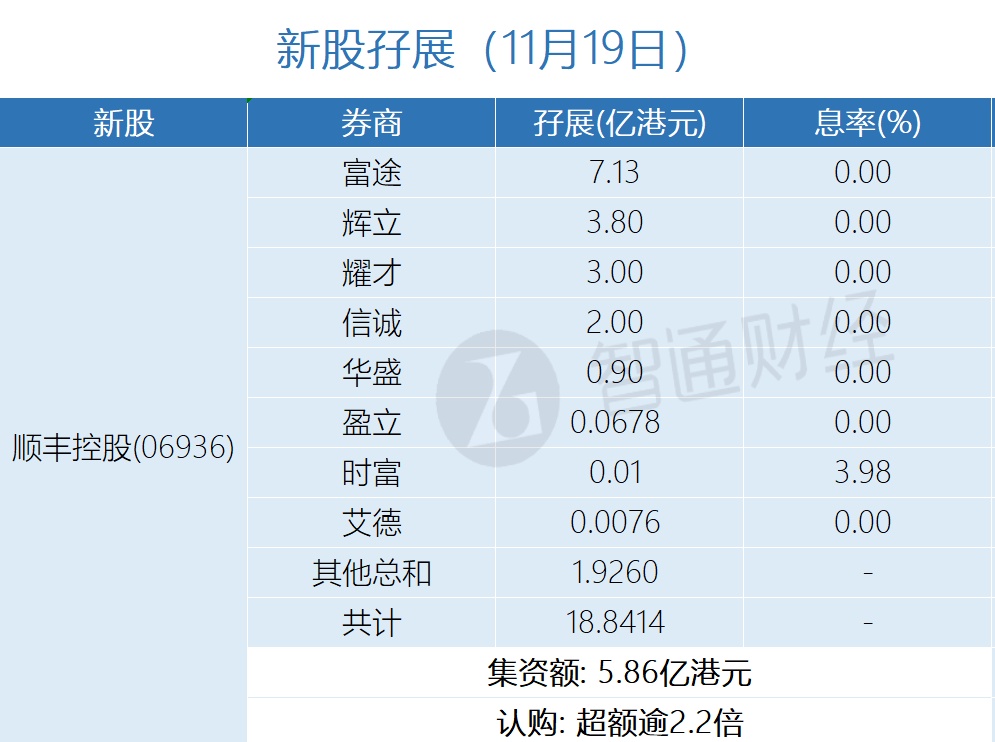 智通财经APP获悉,顺丰控股(06936)正在招股中。截止11月19日,富途、辉立、耀才等券商合计为顺丰控股借出18.8414亿港元,超购逾2.2倍。
