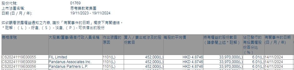智通财经APP获悉,香港联交所最新资料显示,11月14日,FIL Limited增持思考乐教育(01769)45.2万股,每股作价4.8746港元,总金额约为220.33万港元。增持后最新持股数目为3397万股,最新持股比例为6.01%。