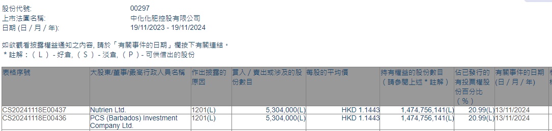 智通财经APP获悉,香港联交所最新资料显示,11月13日,Nutrien Ltd.减持中化化肥(00297)530.4万股,每股作价为1.1443港元,总金额约为606.94万港元。减持后最新持股数目为14.75亿股,最新持股比例为20.99%。