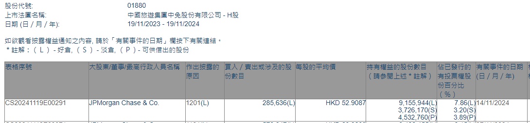 智通财经APP获悉,香港联交所最新资料显示,11月14日,摩根大通减持中国中免(01880)28.5636万股,每股作价为52.9087港元,总金额约为1511.26万港元。减持后最新持股数目为915.59万股,最新持股比例为7.86%。