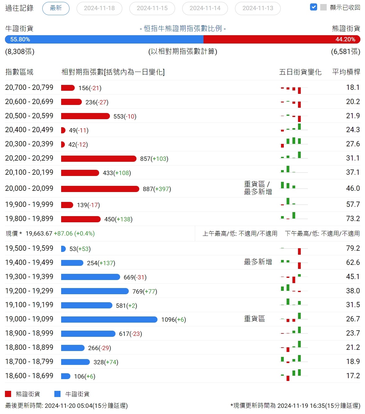 智通财经APP获悉,截至11月20日,恒指最新的牛熊街货比例为56:44。