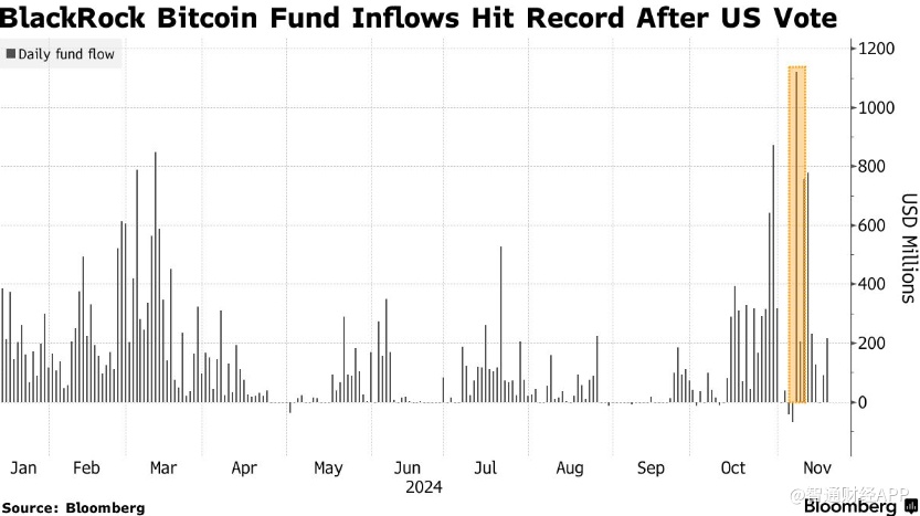 在美国大选后,大量资金流入贝莱德比特币基金