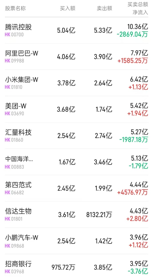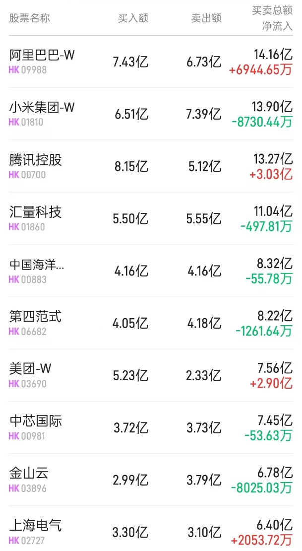 此外,小米集团-W(01810)、上海电气(02727)分别获净买入2604万、2053万港元。而中海油(00883)、中芯国际(00981)分别遭净卖出1.79亿、536万港元。