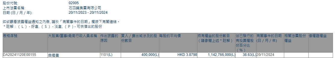 智通财经APP获悉,香港联交所最新资料显示,11月20日,曲继广增持石四药集团(02005)40万股,每股作价3.8798港元,总金额约为155.192万港元。增持后最新持股数目为11.43亿股,最新持股比例为38.63%。