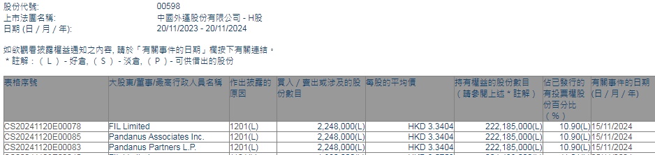 Limited减持中国外运(00598)224.8万股,每股作价3.3404港元,总金额约为750.92万港元。减持后最新持股数目约为2.22亿股,最新持股比例为10.90%。