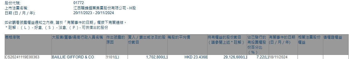 智通财经APP获悉,香港联交所最新资料显示,11月18日,BAILLIE GIFFORD CO增持赣锋锂业(01772)170.28万股,每股作价23.4368港元,总金额约为3990.82万港元。增持后最新持股数目为2912.66万股,最新持股比例为7.22%。