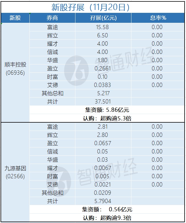 智通财经APP获悉,顺丰控股(06936)、九源基因(02566)正在招股中。截止11月20日,富途、辉立、耀才等券商合计为顺丰控股借出37.5014亿港元,超购逾5.3倍;合计为九源基因借出5.7904亿港元,超购逾9.3倍。