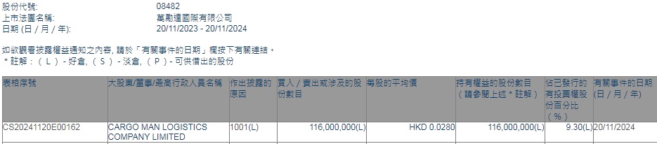 智通财经APP获悉,香港联交所最新资料显示,11月20日,CARGO MAN LOGISTICS COMPANY