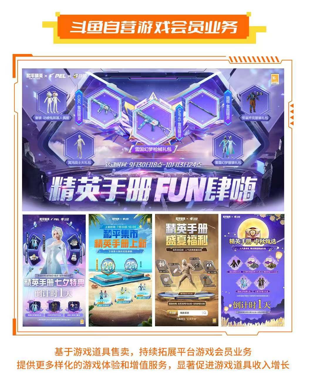 具体来看,斗鱼本季度加强了赛事内容的商业化。基于平台强大的赛事内容矩阵,斗鱼在和平精英PEL官方赛事中推广的游戏会员业务,以及在穿越火线官方赛事直播间开展的道具推广活动均取得了良好的效果。