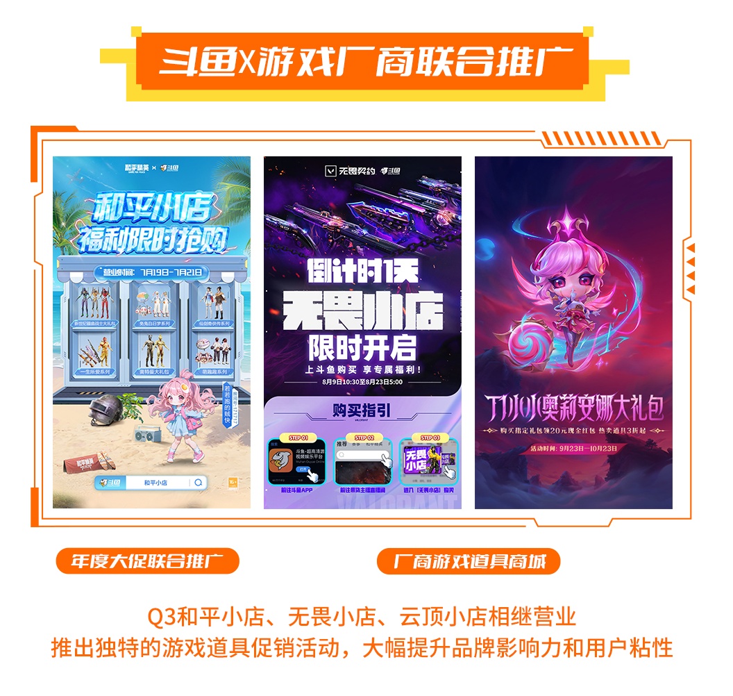在基于游戏道具的商业化方面,斗鱼持续探索包括年度大促联合推广模式、游戏会员业务以及多平台营销活动等在内的游戏道具售卖活动。本季度和平小店、无畏小店、云顶小店等相继营业,吸引了玩家持续消费。通过满足厂商推广与玩家消费需求的多种营销活动,斗鱼已成为玩家进行游戏道具消费的重要平台。