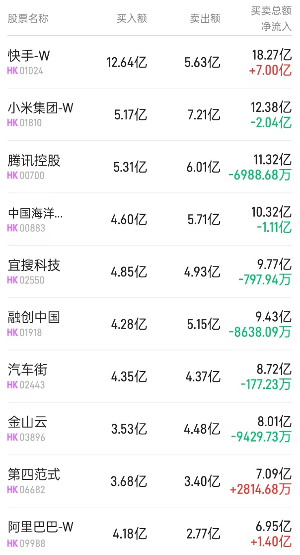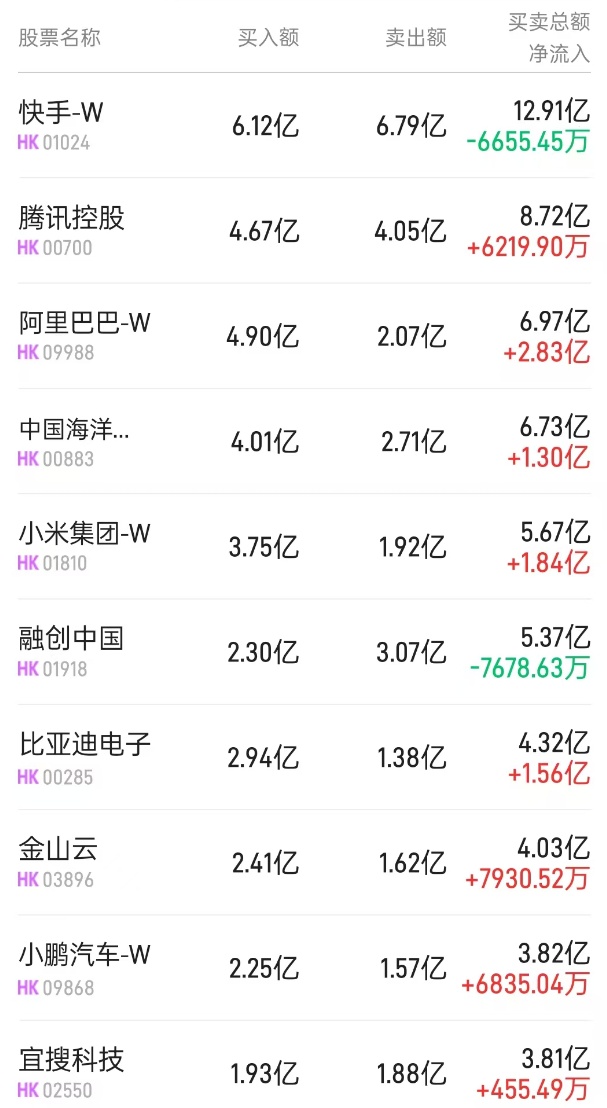 北水净买入最多的个股是快手-W(01024)、阿里巴巴-W(09988)、比亚迪电子(00285)。北水净卖出最多的个股是融创中国(01918)、腾讯(00700)、宜搜科技(02550)。