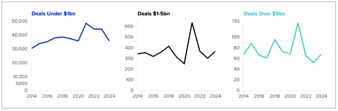 虽然发展势头良好,但市场仍然头重脚轻,100亿美元及以上的交易占据了市场的主导地位。今年到目前为止,此类巨型交易的总价值已增长了34%。
