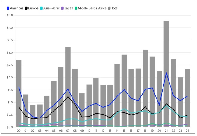 今年前九个月,全球并购金额增长了16%,达到23亿美元。这是自2021年市场达到顶峰以来连续两年下降之后的复苏。进入第四季度,并购市场的发展方向依然积极,第三季度的并购金额比上一季度增长了14%,突破了8000亿美元大关,这是连续九个季度以来首次在三个月内突破8000亿美元大关。