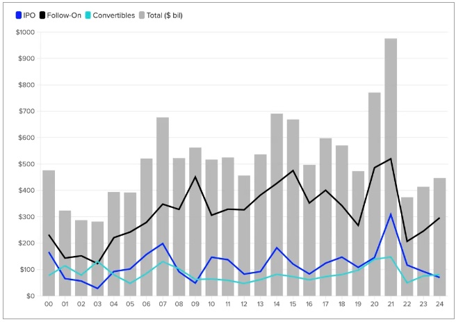 今年前九个月,可转换债券市场小幅增长5%,达到790亿美元的三年新高,而后续股票发行同比增长20%,从2400次发行中募集到2950亿美元,按数量计算增长4%。