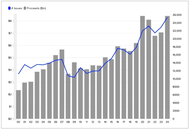 截至9月底,全球债务市场规模增长了18%,达到830亿美元,发行数量也增长了9%,达到近25000次,创下历史新高。这一增长呈现全面性,各行业都实现了同比增长,其中医疗保健、媒体和娱乐以及零售发行商的增长速度达到两位数,领跑市场。