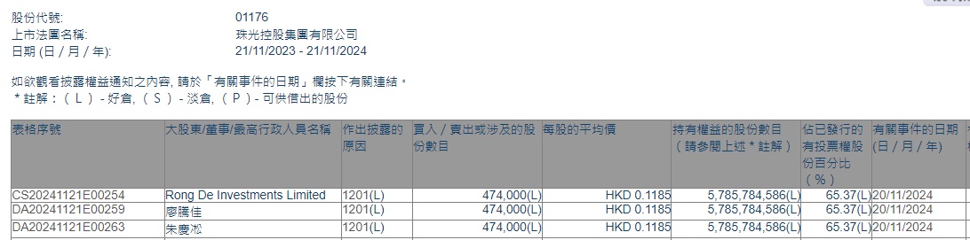 智通财经APP获悉,香港联交所最新资料显示,11月20日,Rong De Investments Limited减持珠光控股(01176)47.4万股,每股作价0.1185港元,总金额约为5.6169万港元。减持后最新持股数目约为57.86亿股,最新持股比例为65.37%。