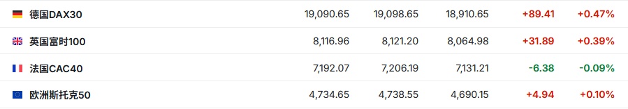 2. 截至发稿,德国DAX指数涨0.47%,英国富时100指数涨0.39%,法国CAC40指数跌0.09%,欧洲斯托克50指数涨0.10%。
