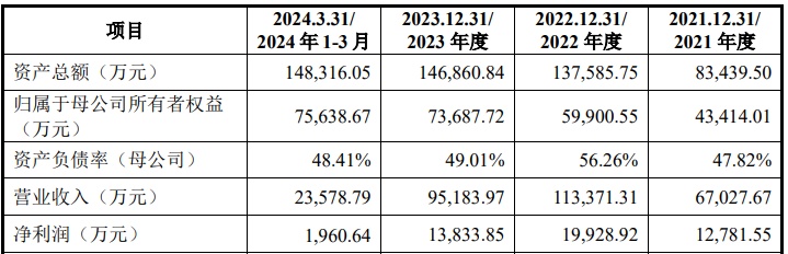 财务方面,2021年、2022年、2023年及2024年1-3月,英思特实现营业收入分别约为人民币6.70亿元、11.34亿元、9.52亿元、2.36亿元,同期净利润分别约为1.28亿元、1.99亿元、1.38亿元、1960.64万元。