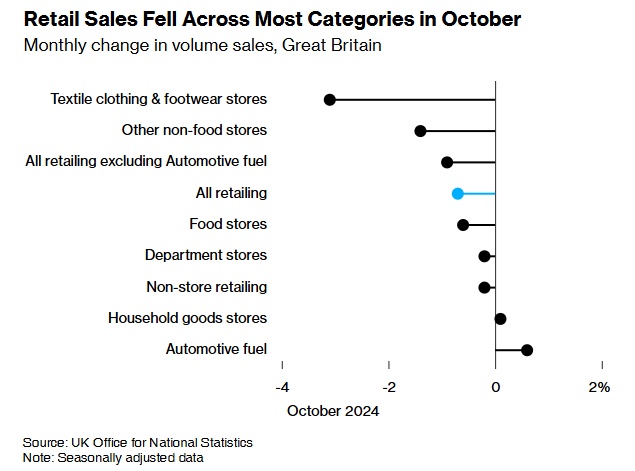 自7月大选以来,英国一度强劲的经济增长已经降温,在英国央行抑制通胀的努力中,相对较高的利率继续拖累产出。英国9月经济意外收缩0.1%,经济学家也将此归咎于对预算案的担忧。这种不确定性掩盖了实际收入的改善、借贷成本的降低和通胀的降温,导致英国家庭日益谨慎、并限制消费。