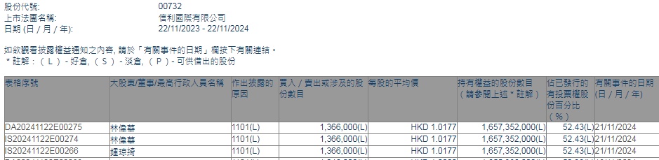 智通财经APP获悉,香港联交所最新资料显示,11月21日,集团主席兼执行董事林伟华增持信利国际(00732)136.6万股,每股作价1.0177港元,总金额约为139.02万港元。增持后最新持股数目约为16.57亿股,最新持股比例为52.43%。