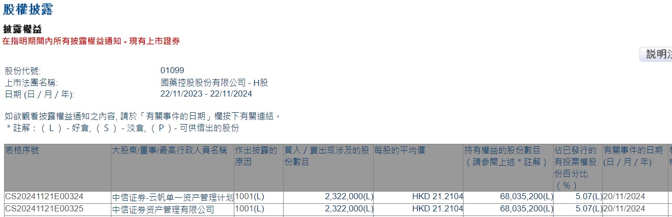 智通财经APP获悉,香港联交所最新资料显示,11月20日,中信证券资产管理有限公司增持国药控股(01099)232.2万股,每股作价21.2104港元,总金额约为4925.05万港元。增持后最新持股数目约为6803.52万股,最新持股比例为5.07%。