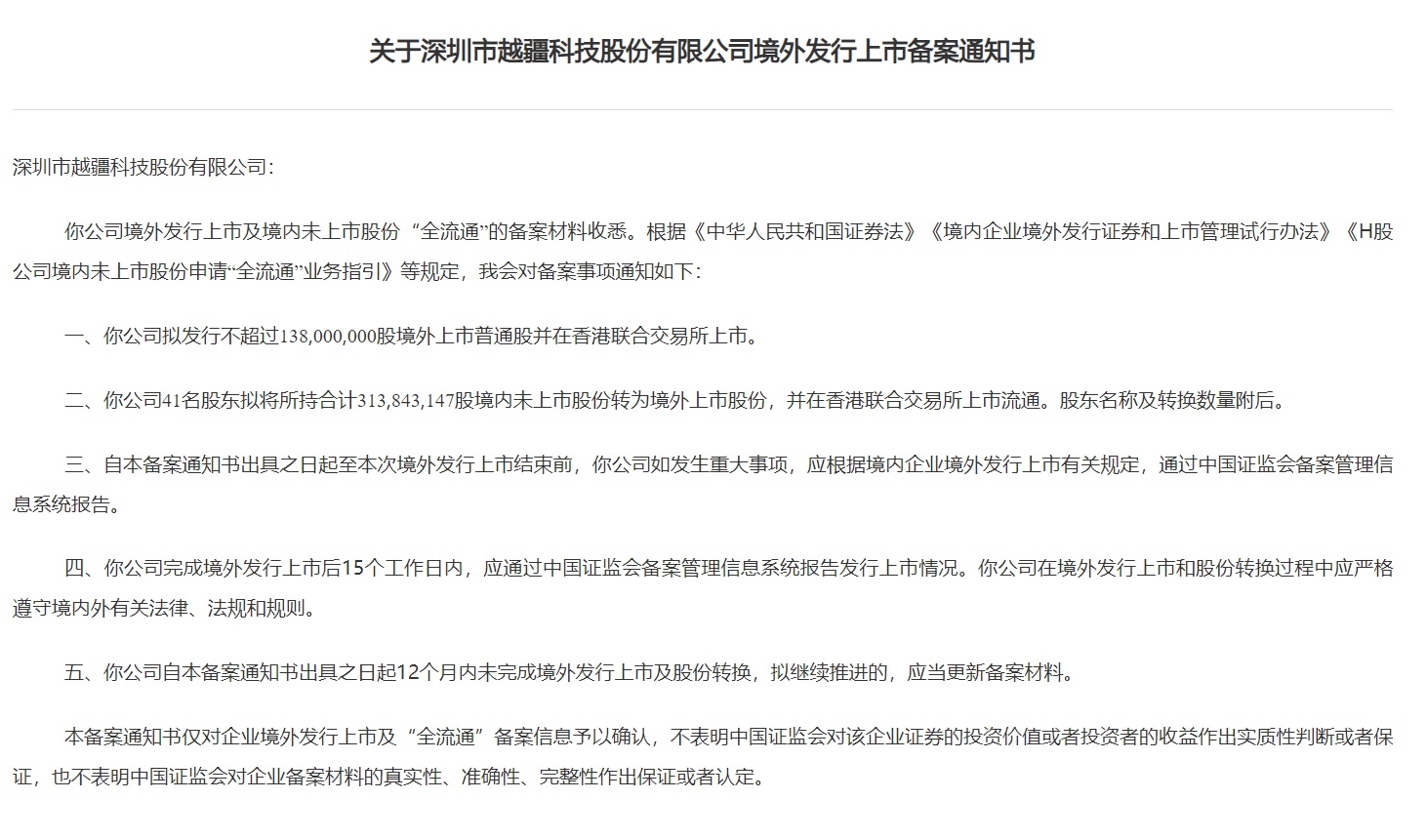 智通财经APP获悉,11月22日,中国证监会国际合作司披露了《关于深圳市越疆科技股份有限公司境外发行上市备案通知书》。该公司拟发行不超过138,000,000股境外上市普通股并在香港联合交易所上市。据港交所6月26日披露,深圳市越疆科技股份有限公司向港交所主板提交上市申请,国泰君安国际及农银国际为联席保荐人。