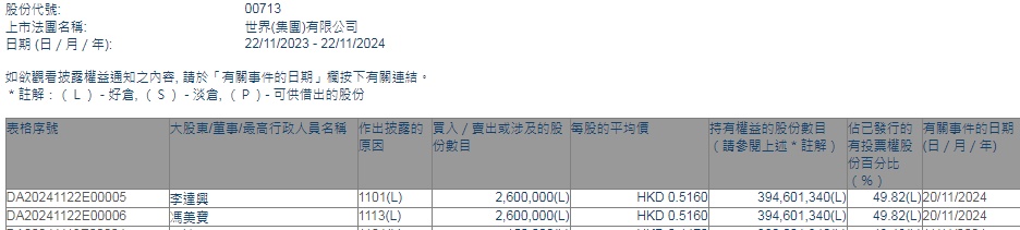 智通财经APP获悉,香港联交所最新资料显示,11月20日,李达兴增持世界(集团)(00713)260万股,平均每股作价为0.516港元,总金额约为134.16万港元。增持后最新持股数目约为3.95亿股,最新持股比例为49.82%。