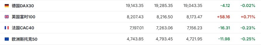 2. 截至发稿,德国DAX指数跌0.02%,英国富时100指数涨0.71%,法国CAC40指数跌0.23%,欧洲斯托克50指数跌0.25%。