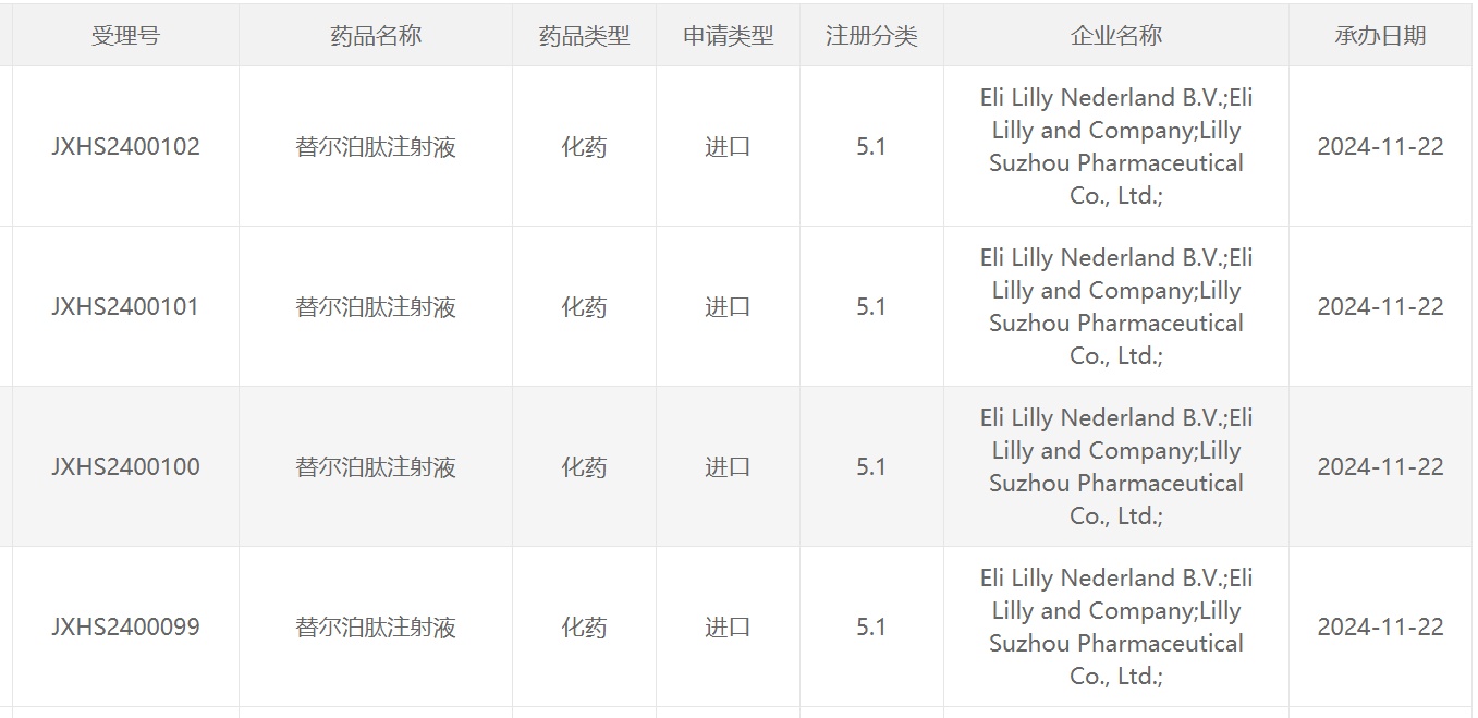 智通财经APP获悉,11月22日,中国国家药监局药品审评中心(CDE)网站最新公示,礼来(LLY.US)重磅药物GIP/GLP-1受体双重激动剂替尔泊肽注射液新适应症上市申请获得受理,具体适应症尚未披露。根据CDE官网查询,这是替尔泊肽在中国递交的第四项上市申请。